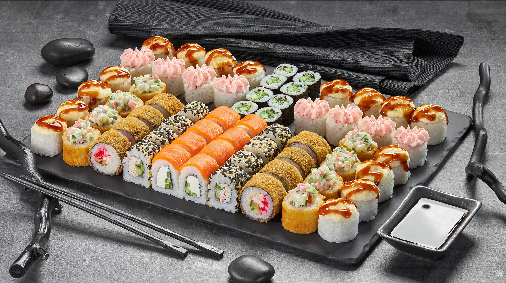 Ролл Филадельфия лайт сяке (8 шт), Ролл Калифорния микс (8 шт), Ролл Мистер барбекю (8 шт), Ролл Лава с креветкой (8 шт), Ролл Чикен темпура (8 шт), Ролл Нежный с курицей запеченный (8 шт), Ролл Сумоку запеченный (8 шт). *Внешний вид блюда может отличаться от фото на сайте.